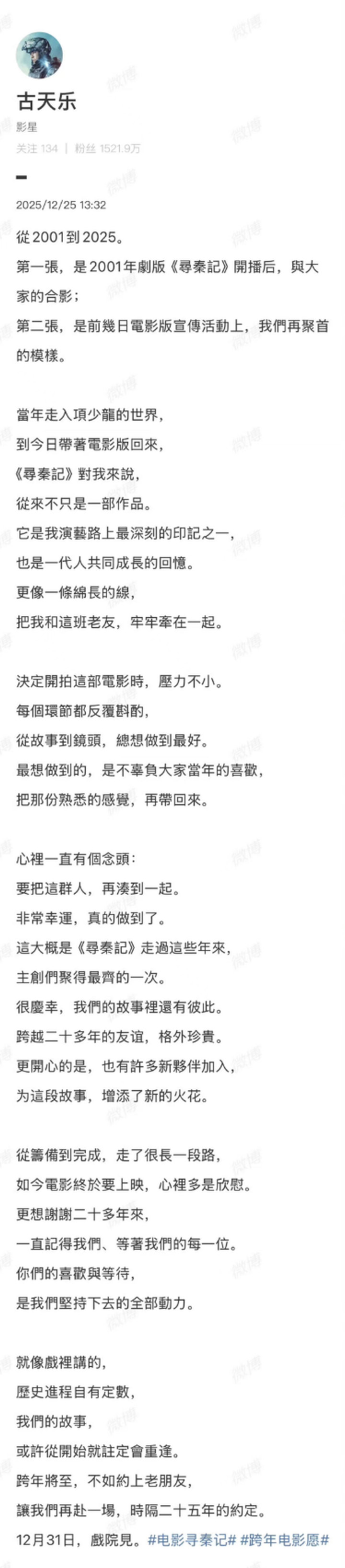 古天乐发博分享两张跨越25年的合影:一张是2001年剧版《寻秦记》开播后主创们的合影;另一张是近日电影版宣传活动上,大家再聚首的模样。古天乐表示这是《寻秦记》走过的这些年来,主创们聚得最齐的一次,跨越二十多年的友谊,格外珍贵。“就像戏里讲的,历史进程自有定数,我们的故事,或许从开始就注定会重逢。”