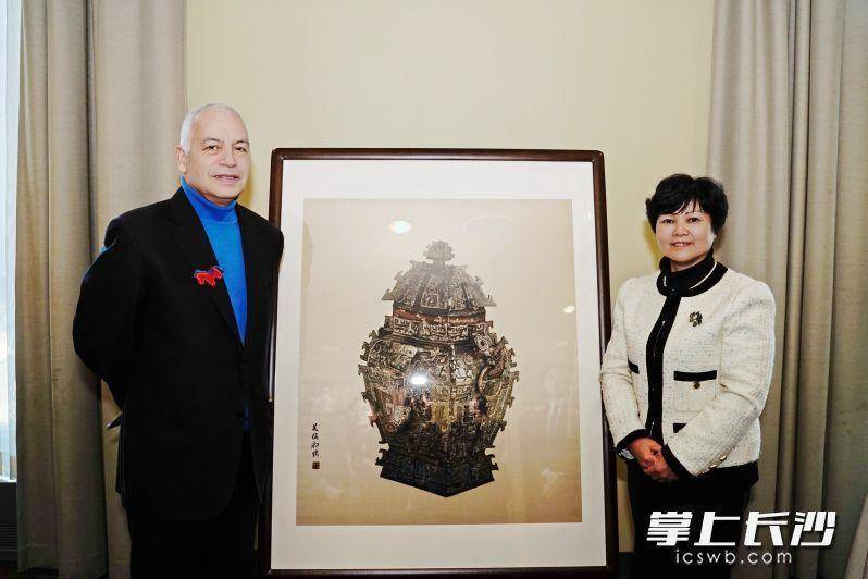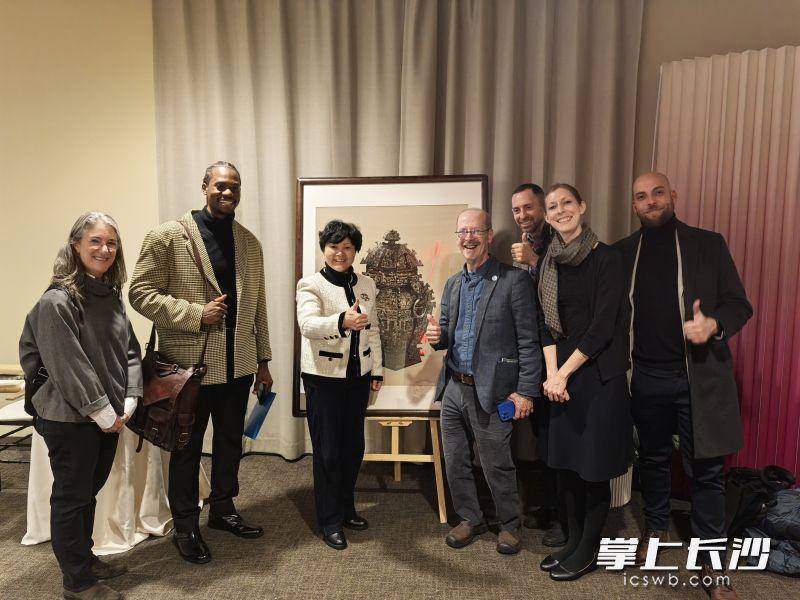 足迹遍布14国 作品蜚声国际在工作室的显眼位置,陈列着一幅湘绣作品《四羊方尊》,这幅作品神奇地用湘绣技艺还原了青铜器的纹路,被业内人士盛赞。同样用湘绣还原青铜器的《皿方罍》更是曾亮相联合国总部的名作。2025年12月,“文明互鉴·和美共生”东方传统工艺当代美术国际特展在联合国总部启幕。这次特展汇聚了104位全球专家与艺术家,邬建美作为湘绣唯一的代表参与了此次盛会并现场进行了刺绣表演,开启了湖湘国潮与全球文化的对话。“纽约的12月寒风刺骨,但当我攥着护照与入场券,站在联合国总部外,望着各国彩旗迎风飘扬,心中的喜悦早已驱散了寒意。我急切地搜寻,当那面鲜红的五星红旗映入眼帘时,身为中国人的自豪与底气油然而生。”邬建美回忆。她的作品一参展,就备受瞩目,联合国训练研究所纽约办公室主任马克·苏哈索先生就感叹,湘绣细腻的针法里藏着中国人对美的极致追求,比文字更能传递文化的温度。之所以选择《皿方罍》参展,邬建美有自己的考量。“这件作品意义非凡。《皿方罍》1919年出土于湖南,器身曾流落海外近百年,直到2014年才由湖南各界斥重金从纽约拍回,实现合体。”邬建美表示,“我运用湘绣这种非遗技艺,践行创造性转化、创新性发展,跨界融合创作了这件作品。如今它能亮相联合国,不仅是艺术的展示,更像是一种文化的回归。青铜器是世界文明的共同语言,以刺绣为媒介连接古代与当代的文化脉络,彰显了中华优秀传统文化的深厚底蕴。”去年11月在沙特参展,邬建美的作品同样受到了得到了沙特文化部和沙特非遗委员会的官方宣传。2025年,她的湘绣作品还被选入故宫博物院展览。从业以来,她携作品到过多少国家呢?“其实之前也没细数过,”邬建美坦言:“因为这次要去联合国总部,办签证时要填写出国经历。我这才算了一下,原来已经走访了14个国家。”她的作品还多次作为国礼赠送给国外政要。