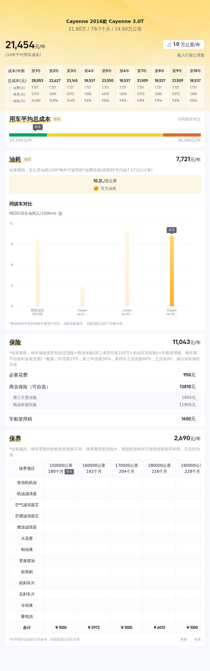 考虑到Cayenne的车况良好,且为高配车型,其市场行情较为乐观。根据当前市场情况,预计该车的售价在21.8万元左右,是一个相对合理的价格区间。在用车成本方面,Cayenne的官方百公里油耗为10.2升,按照每年行驶2万公里计算,燃油费用大约为16360元。此外,保险费用每年约9159元,保养费用每年约为6073元。这些成本都需要在购车前做好充分的预算准备。
