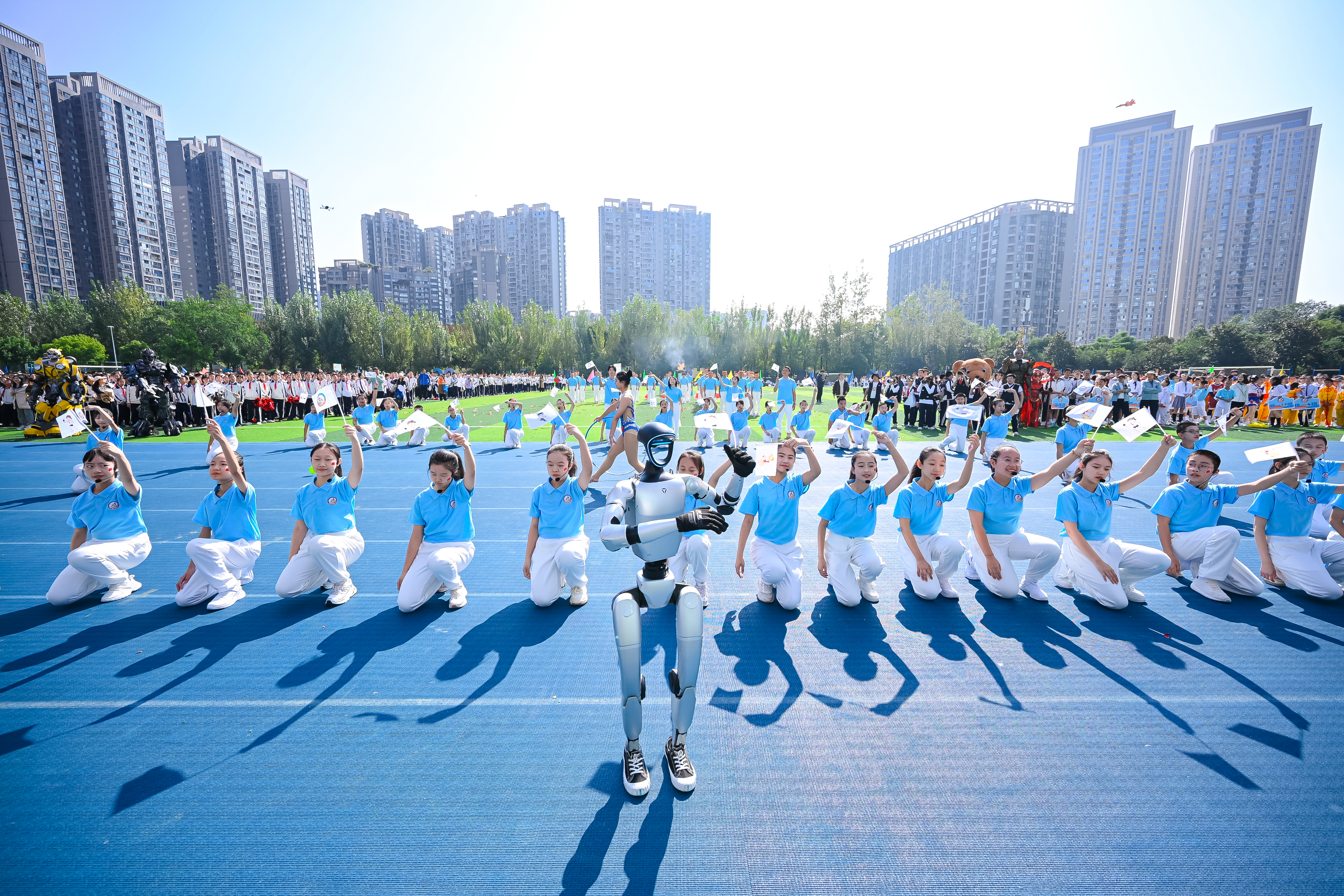 10月27日的开幕式上,AI吉祥物“育才熊”率先登场,萌态十足却科技感满满,瞬间点燃全场热情。国旗方阵、校旗方阵庄严行进,社团展示缤纷多彩,而最令人瞩目的,是首次亮相的“AI方阵”——机器人引领机器狗,在真人机甲护航下整齐列队入场,科技与教育的碰撞激起阵阵惊叹。