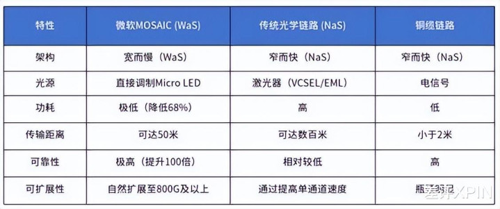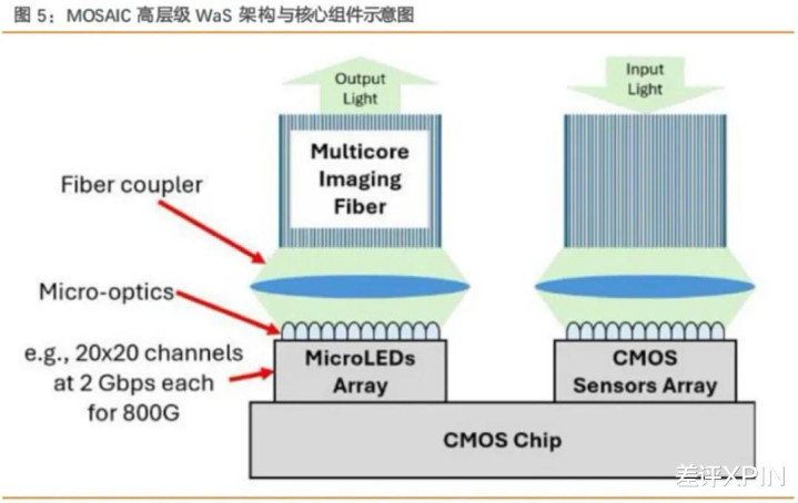 以往要做到 800Gbps 带宽,需要靠 8 个 100Gbps 的高速通道,而 MOSAIC 虽然单个通道降到了 2Gbps,但把 MicroLED 阵列做成 400 个像素点,就可以实现 800Gbps 的带宽。