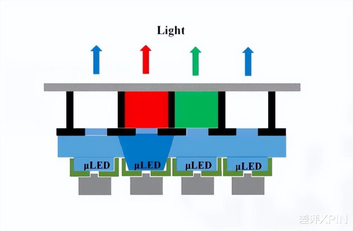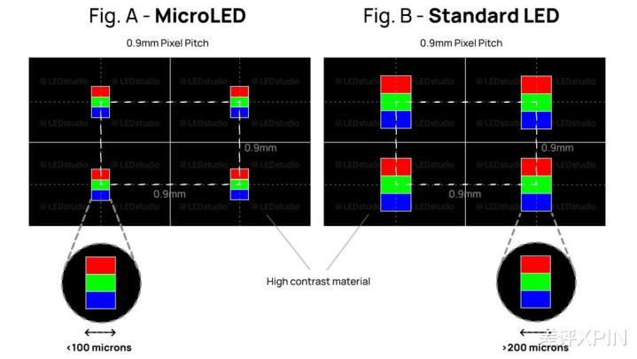 Micro LED 在同样的像素间距下,像素尺寸更小、排列更密集