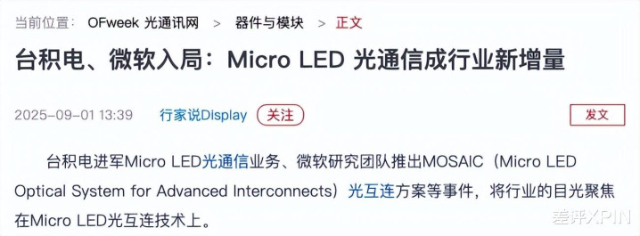 是这样的,前阵子托尼在网上刷到这样一条新闻,说微软正在研究通过 Micro LED 光互联技术(MOSAIC),来解决算力中心的数据传输,被 “卡脖子” 的问题。