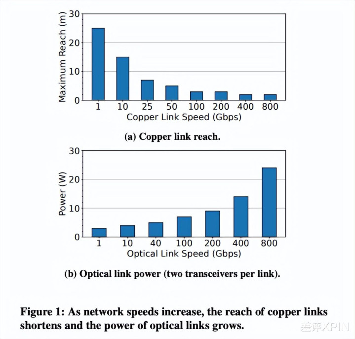 随着传输速率增加,铜缆有效距离逐渐缩短(a)、光纤功耗逐渐增加(b)