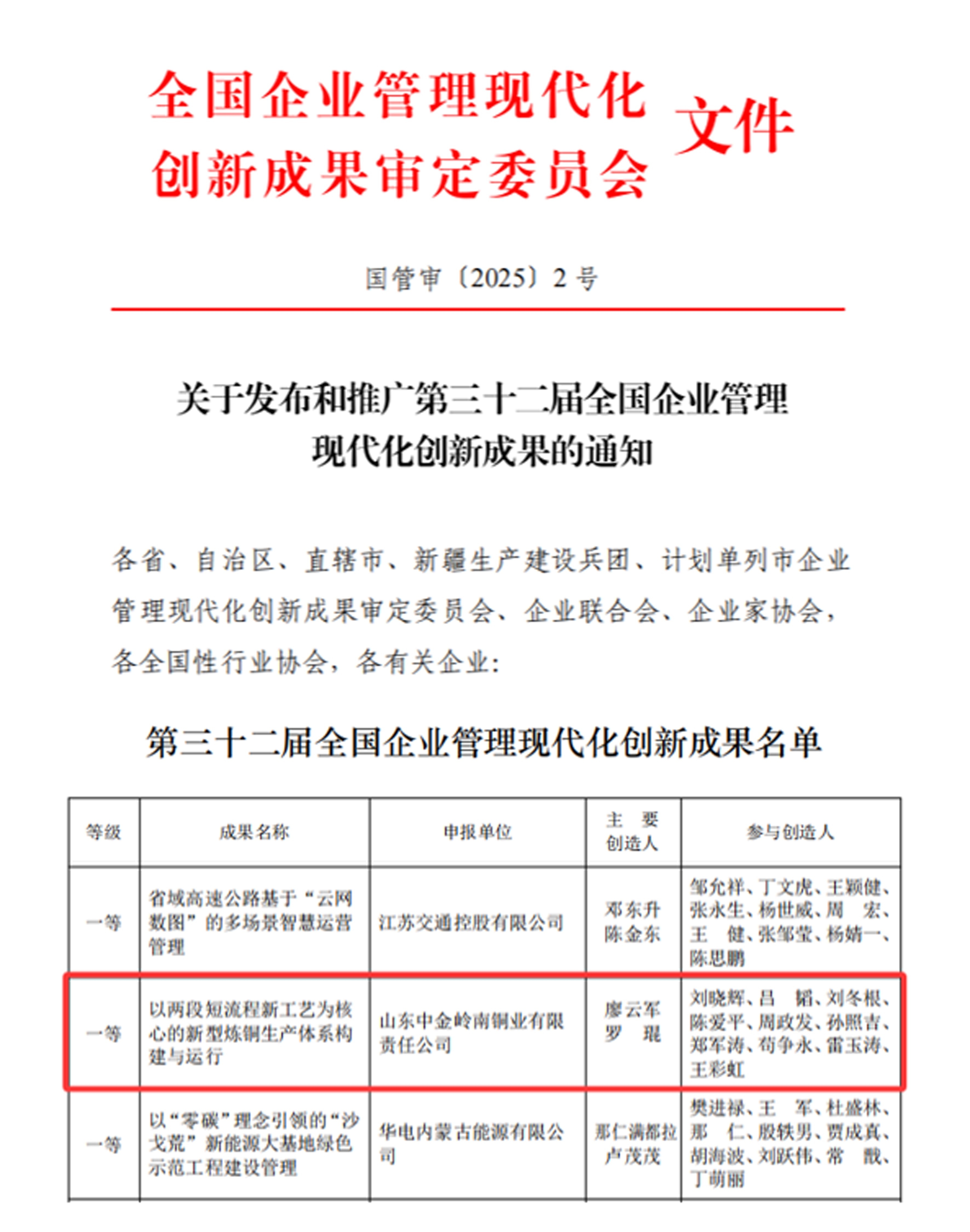 中金岭南所属山东中金岭南铜业有限责任公司(简称“中金铜业”)申报的《以两段短流程新工艺为核心的新型炼铜生产体系构建与运行》从全国966项申报成果中脱颖而出,荣获一等奖,展现了企业在管理创新方面的显著成效,对同类型企业发展和管理进步具有借鉴意义。